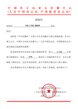 近日,从中国外文局亚太传播中心(人民中国杂志社、中国报道杂志社)获悉,在刚刚结束的第四届“中外传播杯”全国大学生英语翻译大赛中,我院2025届翻译专业研究生石玉姣同学表现优异,荣获汉译英组二等奖。
